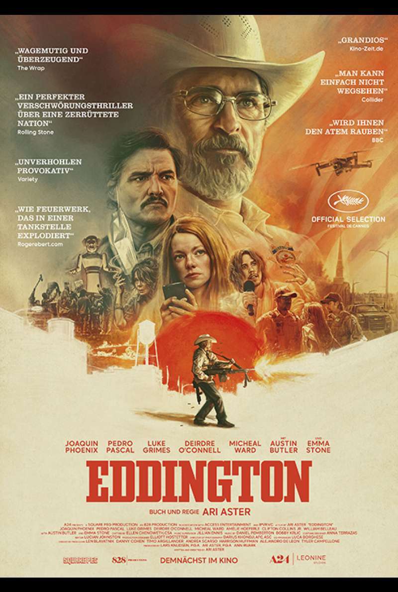 In seinem vierten Film EDDINGTON macht Ari Aster keine Gefangenen. Falls sich Querdenker in den ersten Minuten freuen, dass Hauptdarsteller Joaquin Phoenix einen Maskenskeptiker spielt, werden sie bald eines besseren belehrt, so sie belehrbar wären. Aster teilt in alle Richtungen aus, entlarvt sowohl all die abstrusen Verschwörungstheorien, die hinter allem und jedem ein Komplott der Mächtigen sehen, aber auch die Selbstgerechtigkeit meist junger, weißer Aktivisten, die wenig Ahnung haben, das aber lautstark.